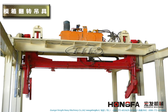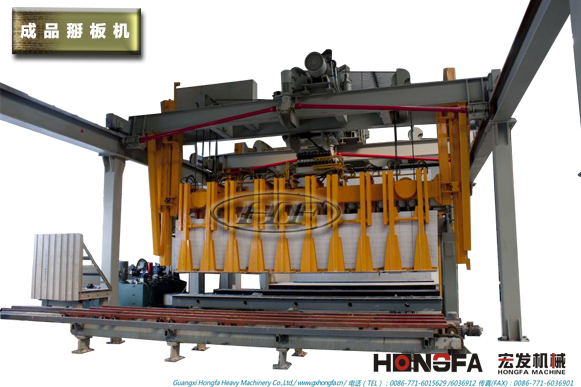 ? 翻轉(zhuǎn)吊具將坯體(帶模具、側(cè)板)在空中翻轉(zhuǎn)90度,吊放置切割臺(tái)或切割小車上,脫模進(jìn)行切割。另外,將脫模下來(lái)的模框與返回的側(cè)板進(jìn)行組模,吊運(yùn)至澆注回車線上進(jìn)行循環(huán)澆注。?